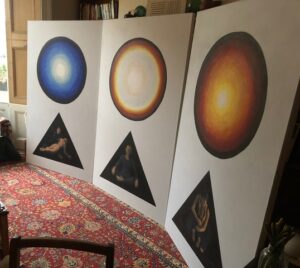 To begin with I made some trial watercolours derived from certain images of ‘divine light’ found in renaissance and baroque church frescoes – without the figures and very simplified. I have used colour declensions seen in ceiling paintings by Gualli (Baciccio), Pozzo and others.